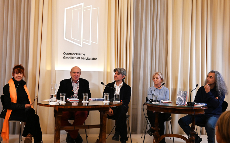 In Veranstaltungsreihe VERSsprechen von Semier Insayif wurde das Projekt nie als allein. Phänomen Dialog & lyrische Interferenzen, Elisa Asenbaum (Hg.), erschienen in der Edition fabrik.transit 2025, vorgestellt. Es lasen und diskutierten Elisa Asenbaum, Herbert J. Wimmer, Harald Hofer, Renate Resch und Semier Insayif. © Peter Bock